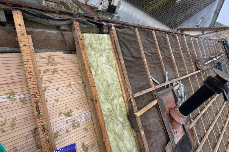 Remplacement des planches de rive, isolation en panneaux rigides, pose de tuiles neuves et zinguerie complète. Chantier réalisé de A à Z par notre équipe.