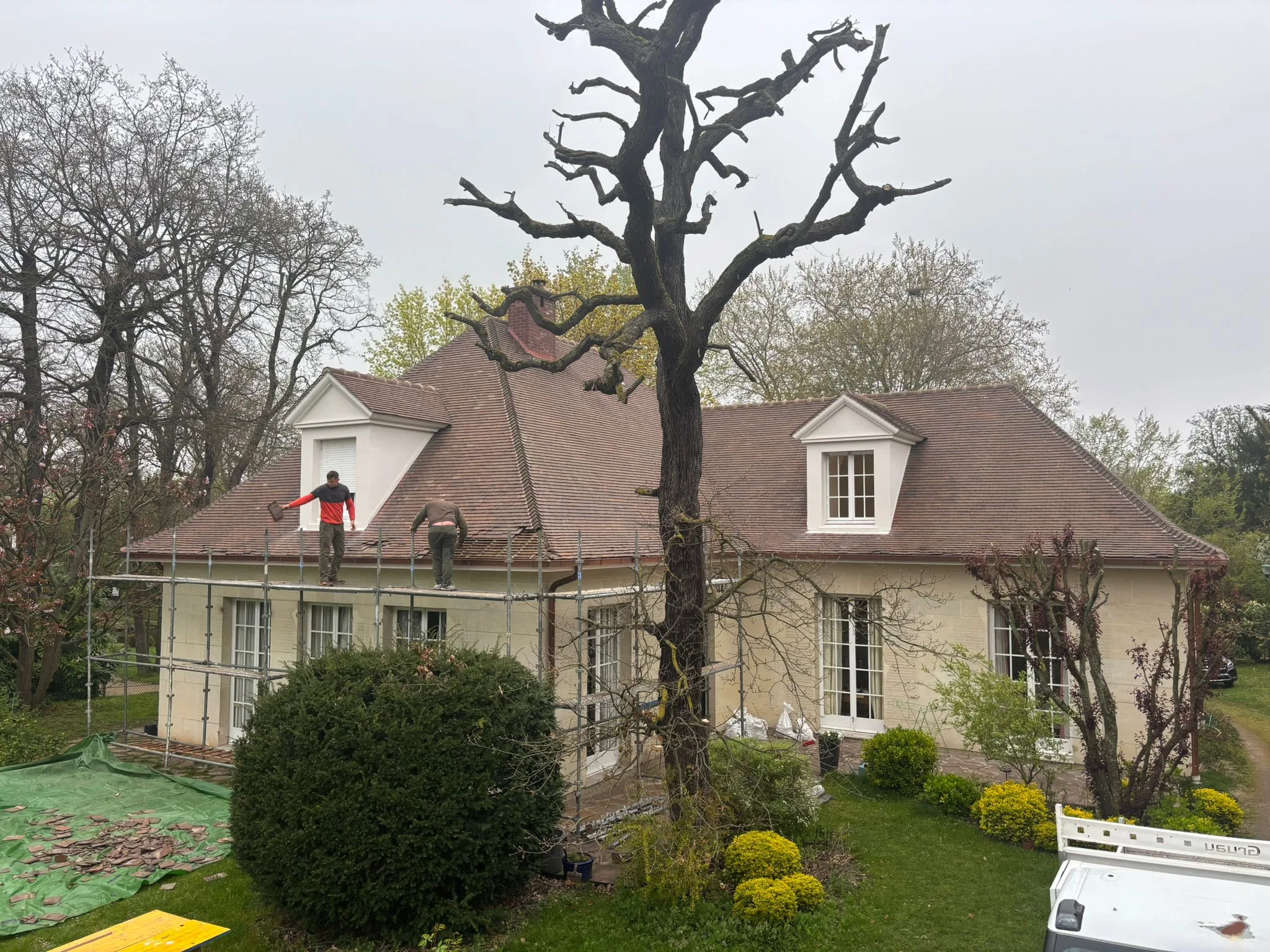 Réfection complète de toiture sur maison bourgeoise avec échafaudage, remplacement de couverture et traitement de charpente. Garantie décennale.
